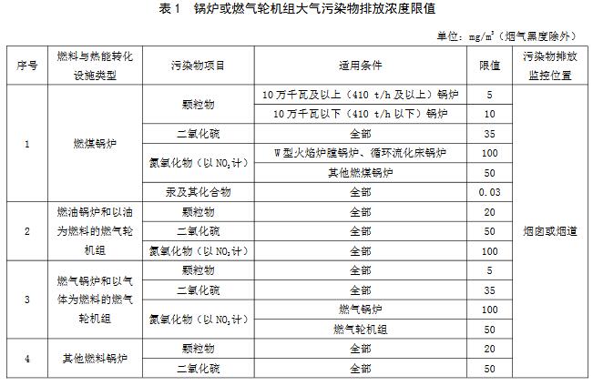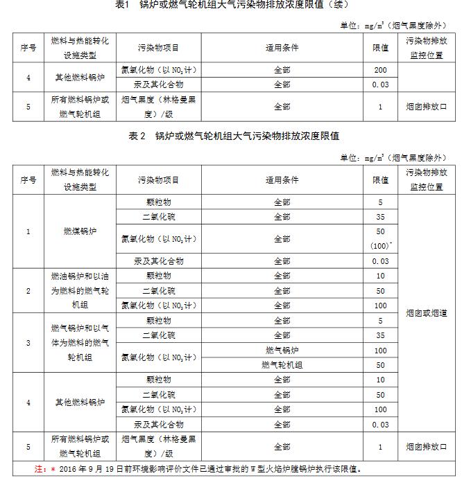 4.22016年9月20日起至本標準實施之日前環(huán)境影響評價文件通過審批的燃煤鍋爐,2017年1月1日起至本標準實施之日前環(huán)境影響評價文件通過審批的燃油鍋爐和以油為燃料的燃氣輪機組、燃氣鍋爐和以氣體為燃料的燃氣輪機組以及其他燃料鍋爐,新建鍋爐或燃氣輪機組,自本標準實施之日起執(zhí)行表2中的排放濃度限值。