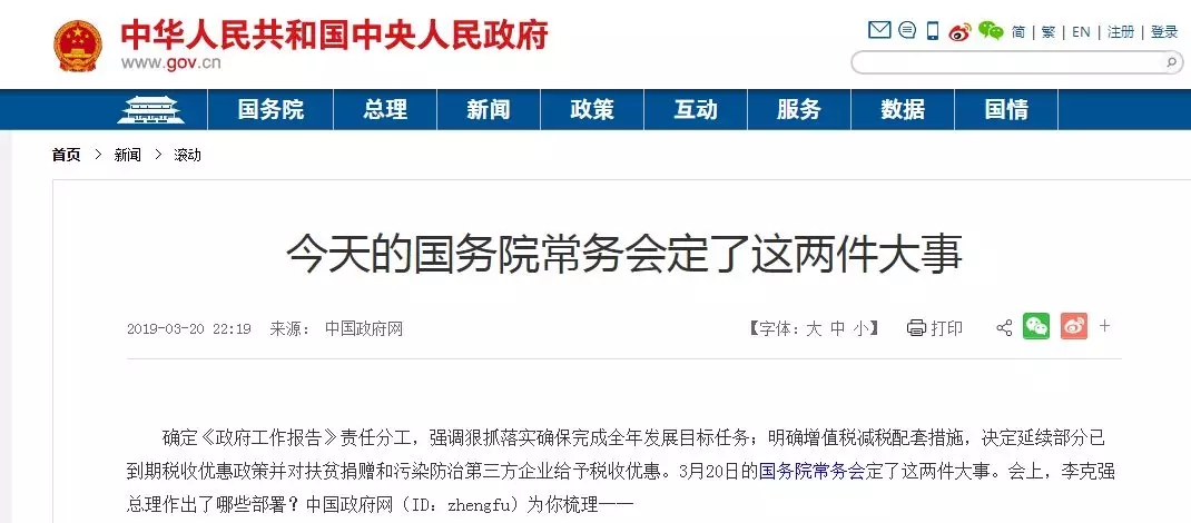 確定《政府工作報(bào)告》責(zé)任分工,強(qiáng)調(diào)狠抓落實(shí)確保完成全年發(fā)展目標(biāo)任務(wù);明確增值稅減稅配套措施,決定延續(xù)部分已到期稅收優(yōu)惠政策并對(duì)扶貧捐贈(zèng)和污染防治第三方企業(yè)給予稅收優(yōu)惠。3月20日的國務(wù)院常務(wù)會(huì)定了這兩件大事。會(huì)上,李克強(qiáng)總理作出了哪些部署?中國政府網(wǎng)(ID:zhengfu)為你梳理──