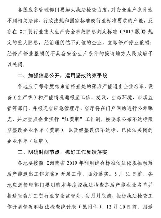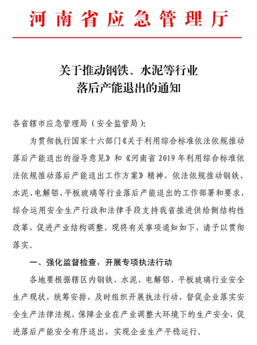4月25日,河南省應急管理廳下發(fā)《關于推動鋼鐵、水泥等行業(yè)落后產能退出的通知》?!锻ㄖ访鞔_表示將利用安全生產行政和法律手段推進水泥、鋼鐵等行業(yè)落后產能退出。《通知》要求各級應急管理部門要加大執(zhí)法檢查力度,對安全生產條件達不到相關法律、行政法規(guī)和國家標準或行業(yè)標準要求的產能,及存在《工貿行業(yè)重大生產安全事故隱患判定標準(2017版)》規(guī)定的重大隱患,經治理仍然不到位的企業(yè),立即停業(yè)停產整頓;經停業(yè)停產整頓仍不具備安全生產條件的提請地方人民政府予以關閉。