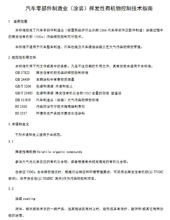 本標(biāo)準(zhǔn)規(guī)定了汽車零部件制造業(yè)(涂裝)揮發(fā)性有機(jī)物污染防治可行技術(shù)。 本規(guī)范按照GB/T 1.1-2009給出的規(guī)則起草。