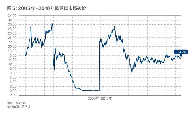 歐盟碳交易起始價較高,2005年初從15歐元/噸價位迅速上漲到28歐元/噸。但在2006年4月底,由于核查排放數(shù)據(jù)泄露,并顯示發(fā)放給成員國的碳配額總數(shù)遠高于實際排放,碳配額嚴重過剩。導致每噸碳價從30歐元暴跌至10歐元。此后,由于配額不能存儲到下一階段導致碳價繼續(xù)暴跌,到2007年底接近零。