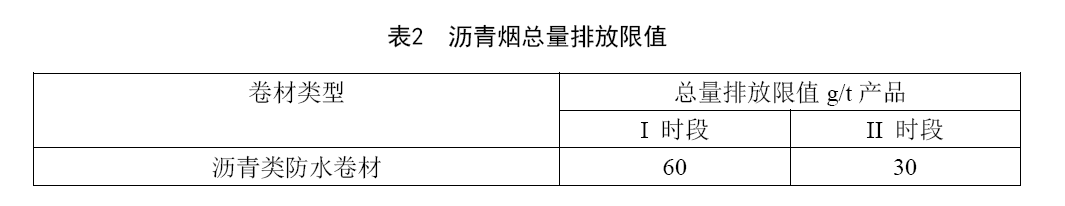 瀝青類防水卷材生產(chǎn)過程中,生產(chǎn)線以單位產(chǎn)品重量核算的瀝青煙排放總量執(zhí)行表2規(guī)定。