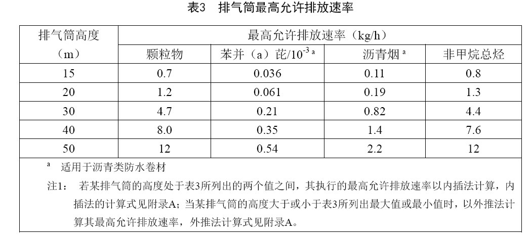 排氣筒中污染物排放除應符合表1最高允許排放濃度外,還應同時滿足表3規(guī)定的排氣筒高度對應的最高允許排放速率要求。