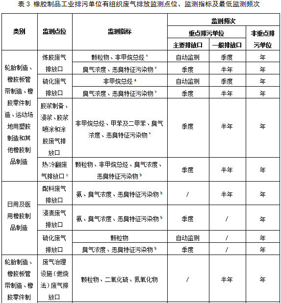 5.2.1.2橡膠制品工業(yè)排污單位有組織廢氣排放監(jiān)測點位、監(jiān)測指標(biāo)及最低監(jiān)測頻次按照表3執(zhí)行。