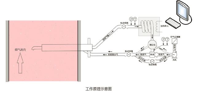 預(yù)處理模塊尾氣經(jīng)采樣探頭重新返回?zé)煹?。所需射流氣、吹掃氣均由潔凈風(fēng)機單元產(chǎn)生,吹掃氣 用于清潔煙塵儀的光學(xué)部件,確保系統(tǒng)長期可靠工作。