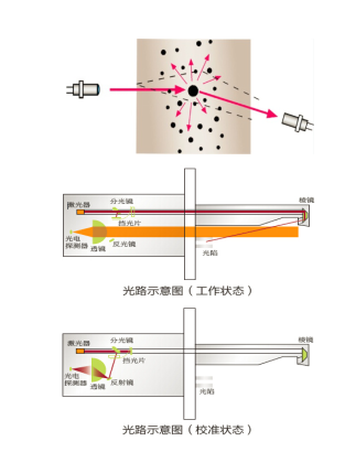Sdust-100型煙塵濃度監(jiān)測儀采用激光后向散射測試原理完成對被測煙道的煙塵濃度的測定。Sdust-100其內(nèi)嵌的高穩(wěn)定激光信號源穿越煙道,照射煙塵粒子,被照射的煙塵粒子將反射激光信號,反射的信號強度與煙塵濃度成正變化。Sdust-100檢測煙塵反射的微弱激光信號,通過特定的算法即可計算出煙道煙塵的濃度。