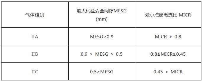 II 類隔爆型電氣設(shè)備或本質(zhì)安全型電氣設(shè)備,按其適用于爆炸性氣體混合物的最大試驗(yàn)安全間隙或最小點(diǎn)燃電流比,進(jìn)一步分為 IIA 、 IIB 和 IIC 類。如下表所示。