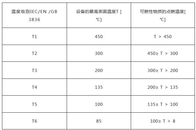 這是與氣體點(diǎn)燃溫度有關(guān)的電氣設(shè)備(假定環(huán)境溫度為 40 ℃時(shí))的最高表面溫度,點(diǎn)燃能量與點(diǎn)燃溫度無(wú)關(guān)。