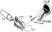 光源發(fā)出的紫外光通過光纖傳輸?shù)綔y量室,測量室樣氣在特定波段吸收紫外光譜能量,被吸收后的光束通過光纖傳輸?shù)焦庾V儀,在光譜儀內(nèi)部經(jīng)過光柵分光,由二極管陣列檢測器將分光后的光信號轉(zhuǎn)換為電信號,獲得氣體的連續(xù)吸收光譜信息,最后根據(jù)特定算法計算待測氣體濃度。其結(jié)構(gòu)示意圖如下: