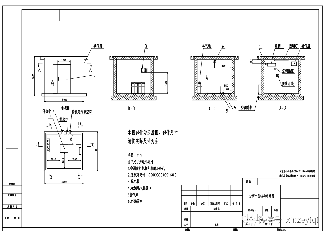 l  開孔:在監(jiān)測房內(nèi)放置機柜背面墻壁(必要時側(cè)墻也可以,依據(jù)現(xiàn)場走線方便),距離地面高度的2.5m處,為樣氣管路及電纜管路開孔,開孔尺寸為Φ90mm圓孔,開孔數(shù)量1個;在機柜背面墻壁接近地面底部上開孔,開孔尺寸為ф40mm,開孔數(shù)量1個,作為廢氣廢水排放口;站房內(nèi)應(yīng)安裝排氣扇,應(yīng)預(yù)留安裝排氣扇孔位,具體開孔尺寸依據(jù)所購買排氣扇尺寸;安裝空調(diào)開孔尺寸為Φ90mm圓孔;