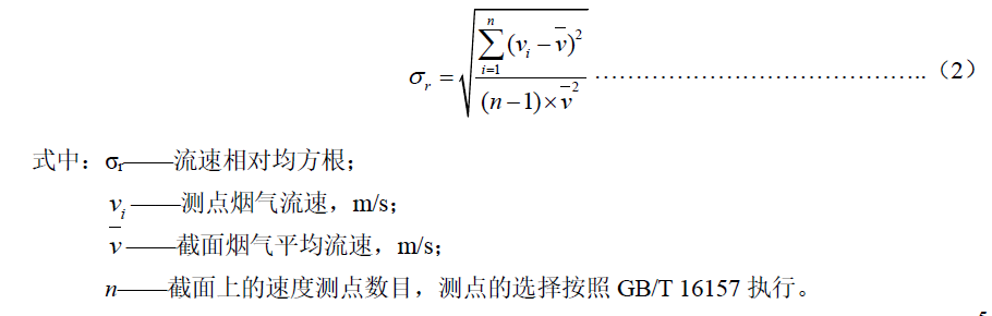 新建煙氣排放污染源的在線監(jiān)測設(shè)備安裝要求,采樣平臺應(yīng)與排氣裝置同步設(shè)計、同步建設(shè),確保采樣斷面滿足本標(biāo)準(zhǔn) 7.1.2.2 的要求;對于現(xiàn)有排放源,當(dāng)無法找到滿足 7.1.2.2 的采樣位置時,應(yīng)盡可能選擇在氣流穩(wěn)定的斷面安裝 CEMS 采樣或分析探頭,并采取相應(yīng)措施保證監(jiān)測斷面煙氣分布相對均勻,斷面無紊流。對煙氣分布均勻程度的判定采用相對均方根σ 法,當(dāng)σ ≤0.15 時視為煙氣分布均勻,σr 按式(2)計算。