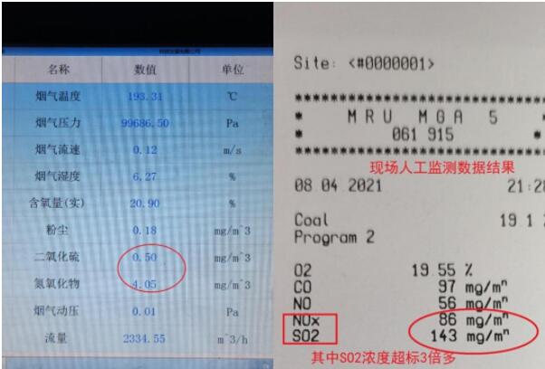 企業(yè)煙氣在線監(jiān)測(cè)系統(tǒng)的日常運(yùn)維交給第三方山西世紀(jì)天源環(huán)保技術(shù)有限公司負(fù)責(zé)。督察發(fā)現(xiàn),運(yùn)維公司通過在線監(jiān)測(cè)數(shù)據(jù)造假等方式,掩蓋恒達(dá)公司偷排和嚴(yán)重超標(biāo)排放的違法事實(shí)。煙道煙溫是判斷旁路煙氣是否偷排的重要指標(biāo),但運(yùn)維公司人員在日常運(yùn)維中一直上報(bào)煙溫監(jiān)測(cè)設(shè)備存在故障,認(rèn)為數(shù)據(jù)失真,而對(duì)煙氣二氧化硫、氮氧化物濃度長(zhǎng)期低于10毫克/立方米的異常情況熟視無(wú)睹,裝聾作啞。經(jīng)現(xiàn)場(chǎng)人工監(jiān)測(cè),煙氣實(shí)際二氧化硫和氮氧化物排放濃度分別為143毫克/立方米和86毫克/立方米,其中二氧化硫濃度超過《煉焦化學(xué)工業(yè)污染物排放標(biāo)準(zhǔn)》3.8倍,與此同時(shí)在線監(jiān)測(cè)數(shù)據(jù)卻顯示二氧化硫、氮氧化物濃度分別為0.50毫克/立方米和4.05毫克/立方米,數(shù)據(jù)嚴(yán)重失真,存在造假行為?!鲌D7 在線監(jiān)測(cè)數(shù)據(jù)(左圖)顯示二氧化硫和氮氧化物濃度分別為0.50毫克/立方米和4.05毫克/立方米;而現(xiàn)場(chǎng)人工監(jiān)測(cè)數(shù)據(jù)(右圖)顯示二氧化硫和氮氧化物實(shí)際濃度分別為143毫克/立方米和86毫克/立方米。在線監(jiān)測(cè)數(shù)據(jù)嚴(yán)重失真,存在造假行為。