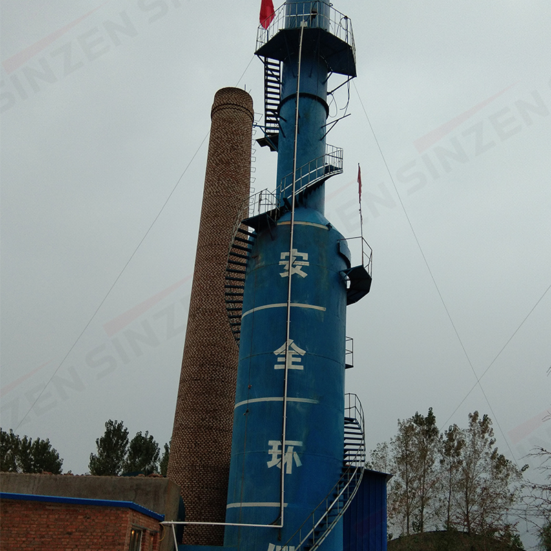 脫硫塔主要由筒體,噴霧裝置、篩板、脫水除霧裝置、溢水孔、清理孔等組成,其工作原理是:含煙塵及硫氧化物的煙氣流通過進口煙道進入筒體,含有[OH-]離子的堿性水分別從脫硫塔上中下部由螺旋噴嘴噴出,形成與煙氣成逆向的多排高速霧化水幕,增加了煙塵硫氧化物與水的碰撞概率,并充分利用霧化液滴的速度來造成很高的氣液相對速度,以保證除塵和脫硫效果。同時氣體經(jīng)過篩板時對篩板上的液層產(chǎn)生鼓泡作用,增加了氣液傳質的表面積和湍動狀態(tài),提高了傳質速率,二氧化硫與堿液發(fā)生氣液交換,進一步提高了脫硫效果。脫硫生成物隨水流到脫硫塔底部,從溢水孔排走,在筒體底部封底并設有水封槽以防止煙氣從底部泄漏,備有清理孔便于進行筒體底部清理。脫硫后廢水由底部溢流孔排出進入沉淀池,沉淀中和再生,循環(huán)使用。凈化后的氣體,通過筒體上部經(jīng)除霧后引出,從而達到除塵脫硫目的。