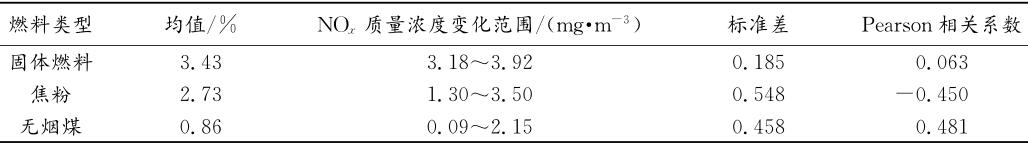 因此,在探討固體燃料類型對(duì)NOx排放的影響規(guī)律時(shí),將固體燃料比例固定,研究焦粉和無(wú)煙煤的比例變化對(duì)煙氣NOx排放的影響規(guī)律。根據(jù)固體燃料比例樣本數(shù)據(jù)的分布規(guī)律,選取具有代表性的固體燃料比例為3.3%~3.5%的樣本數(shù)據(jù)進(jìn)行相關(guān)性分析研究,結(jié)果見表3。