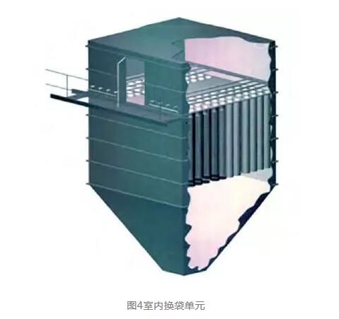 2005年,結(jié)合琉璃河水泥廠窯尾電除塵器改造,我們開(kāi)始推出凈氣室室內(nèi)換袋結(jié)構(gòu)的袋除塵器(圖4),大大降低了整機(jī)漏風(fēng)率。