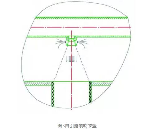 2001年,我們開(kāi)始研究行噴脈沖清灰長(zhǎng)袋袋收塵器。除塵器的新結(jié)構(gòu)采用自引流脈沖噴吹裝置(非文氏管)(圖3)和長(zhǎng)袋分排清灰,將袋長(zhǎng)由3m加長(zhǎng)到6m以上,基本解決了袋長(zhǎng)限制。