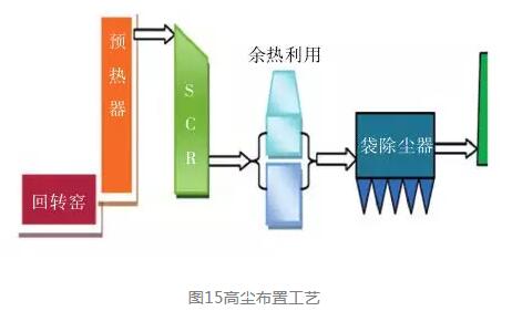 圖17為傳統(tǒng)的低塵布置工藝,采用傳統(tǒng)的高溫袋除塵器可以保證進(jìn)入SCR反應(yīng)器的廢氣含塵量極低,這樣粉塵對(duì)SCR催化劑的影響小。但由于傳統(tǒng)濾袋的耐溫限制,通常需要采用六級(jí)預(yù)熱器,或優(yōu)先通過(guò)SP余熱鍋爐降溫,或采用增濕塔將預(yù)熱器出口廢氣溫度降低到≤280℃,并且不允許出現(xiàn)超溫事故。降溫除塵后,為了滿足氮氧化物最佳催化還原反應(yīng)溫度,需要對(duì)煙氣進(jìn)行再加熱,這無(wú)疑會(huì)使工藝復(fù)雜且有能源消耗。如果研發(fā)出有效可靠的低溫催化劑,無(wú)需對(duì)氣體再加熱,則是一個(gè)理想的選擇。