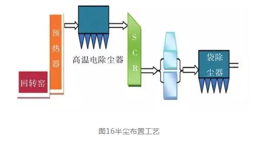 圖16為水泥廠SCR脫硝的半塵布置或中塵(MiddleDust)布置工藝,它需要在SCR反應(yīng)器之前安裝高溫電除塵器。因?yàn)楦邷仉姵龎m器的除塵效率不能達(dá)到很高,所以出口含塵量仍然較高,特別是除塵器電場(chǎng)事故致使廢氣含塵量高不可避免,半塵布置方案也與高塵方案存在同樣問(wèn)題。另外,通過(guò)高溫電除塵器的氣體溫度還會(huì)有所降低,也不利于常規(guī)催化劑高效運(yùn)行。國(guó)內(nèi)外實(shí)際應(yīng)用的報(bào)導(dǎo)都同樣是不能穩(wěn)定運(yùn)行。