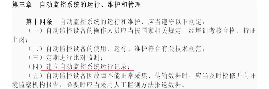 1、《污染源自動監(jiān)控管理辦法》中要求建立自動監(jiān)控系統(tǒng)運行記錄,在線監(jiān)測記錄直接反應(yīng)自動監(jiān)控系統(tǒng)運行情況。