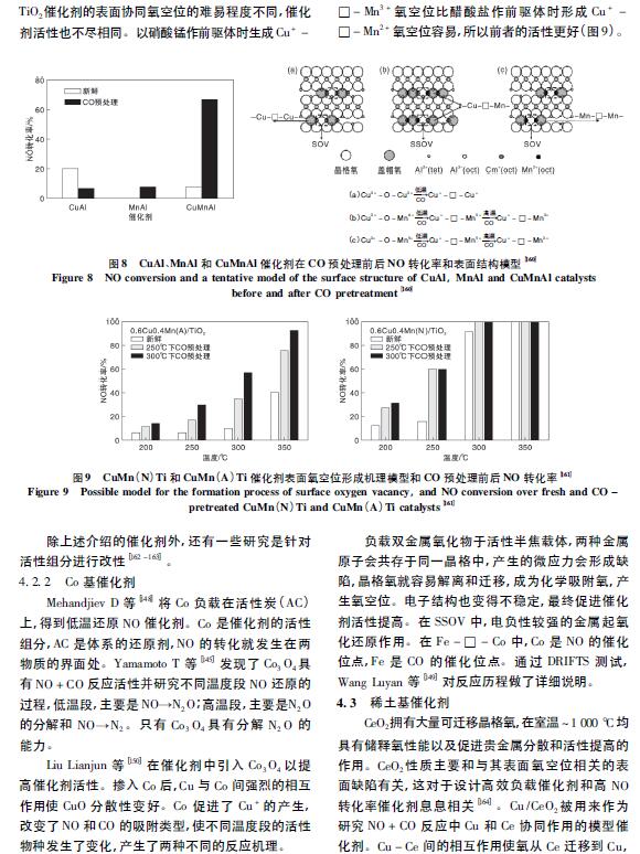 在CeTi 催化劑中,Ce 和Ti 在原子級別上的相互作用產(chǎn)生的Ce - O - Ti 有助于提高催化劑活性。Li Ping 等[75]用FETEM 直接觀察到Ce - O - Ti 結(jié)構(gòu),無定型Ce0. 3 TiO∞在( 175 ~ 400) ℃ 時的NO 轉(zhuǎn)化率為90%。此外,利用XANES 和原位FTIR 等證明了表面高度分散的Ce - O - Ti 結(jié)構(gòu)是反應(yīng)的活性中心。Chen Lei 等 利用溶膠- 凝膠法合成CuCeTi 催化劑,在( 150 ~ 250) ℃時的NO 轉(zhuǎn)化率大于80%,Cu 提供的L 酸位點成為反應(yīng)的活性中心,加速了低溫段快速SCR 反應(yīng)過程。在此基礎(chǔ)上進行改進( 圖5) ,在Ce - Ti 催化劑中摻雜了少量Cu2 + ,可以顯著提高催化劑的低溫SCR 活性。研究表明,Cu 與Ce 物質(zhì)的量比0. 005 時,( 200 ~400) ℃的NO 轉(zhuǎn)化率為80%,N2選擇性為100%。Cu - O - Ce 的形成促進了Ce4 + 向Ce3 + 的轉(zhuǎn)化,增加了表面活性氧。分散態(tài)Cu 增加了Ce -Ti 催化劑表面酸性,提高了NH3吸附能力,從而加速了反應(yīng)向E - R 機理方向進行。在Ce - Ti 催化劑中摻雜W 可以在Ce - W 間產(chǎn)生強烈的相互作用,產(chǎn)生更多的Ce3 +、NOx 和NH3吸附物種,從而提高催化劑活性。Fu Mengfan 等發(fā)現(xiàn),采用共浸漬法時,在( 200 ~ 400) ℃ 的NO 轉(zhuǎn)化率大于90%。利用均相沉淀法進一步提高了Ce -W - Ti 催化劑在高空速下的活性,在Ce 與W 物質(zhì)的量比1∶ 1、空速500 000 h - 1和溫度( 275 ~ 400) ℃條件下,NO 轉(zhuǎn)化率為90%。W 的引入促進了活性Ce 的分散,增加了催化劑表面活性CeO2晶體、氧空位和酸位。在低溫段( < 300 ℃) ,W 促進了NO 向NO2的氧化,在高溫段( > 300 ℃) ,W 提高了N2選擇性。
