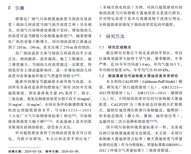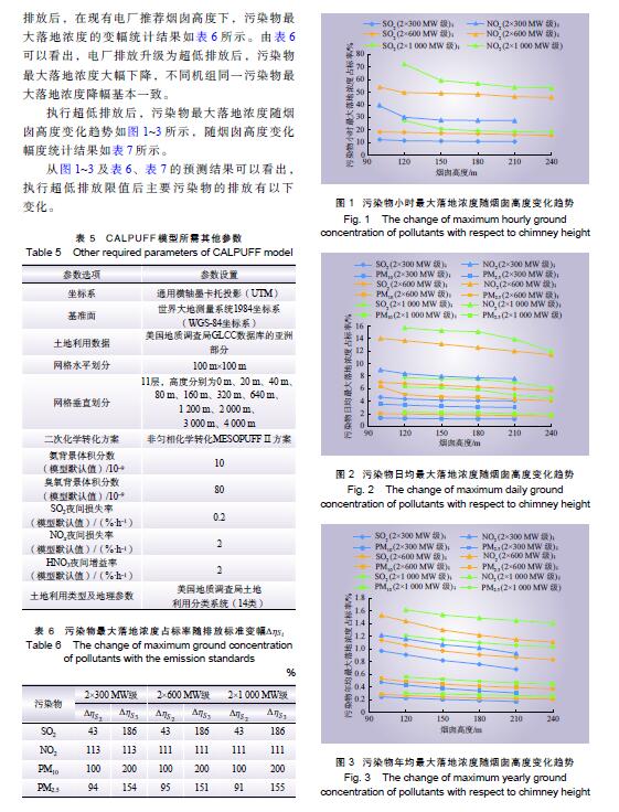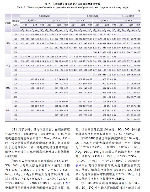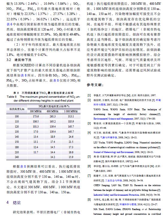 摘 要:燃煤電廠全面實施超低排放后,煙氣污染物排放水平大幅降低,是否仍需采用高煙囪排放已引起關注。以平原區(qū)不同容量燃煤電廠為例,對超低排放水平下煙囪高度與污染物最大落地濃度關系進行研究,并對特定高度下是否出現(xiàn)建筑物下洗進行判定,分析煙囪高度優(yōu)化的可能性。研究結果表明:平原區(qū)燃煤電廠執(zhí)行超低排放限值后,300 MW、600 MW、1 000 MW級機組煙囪從現(xiàn)有推薦高度分別降低至130 m、140 m、150 m時,污染物最大落地濃度增幅不顯著,初步判定污染物增加幅度可接受且不會出現(xiàn)建筑物下洗,煙囪高度存在優(yōu)化降低的空間。