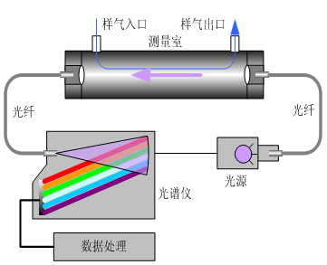 煙氣分析儀是基于紫外吸收光譜分析技術(shù)和紫外差分算法(DOAS)的氣體分析儀器。光源發(fā)出的光束匯聚進入光纖,通過光纖傳輸?shù)酵庵玫母邷販y量室,穿過氣體室時被待測氣體吸收后,由光纖傳輸?shù)焦庾V儀,在光譜儀內(nèi)部經(jīng)過光柵分光,由陣列傳感器將分光后的光信號轉(zhuǎn)換為電信號,獲得氣體的連續(xù)吸收光譜信息。儀器根據(jù)此光譜信息采用差分吸收光譜算法(DOAS),得到被測氣體的濃度。
