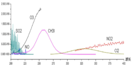 分析儀采用紫外差分算法檢測氣體濃度,其中SO2、NO、NO2等氣體在紫外波段存在吸收(如圖二),利用此光路(如圖一)即可計算出吸收光譜,然后利用DOAS技術(shù),可以計算得到SO2、NO、NO2等氣體的含量,DOAS技術(shù)可以確保計算結(jié)果受光路污染、氣體中粉塵等雜質(zhì)的影響小。