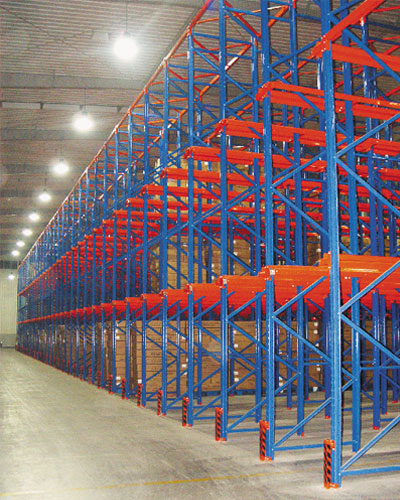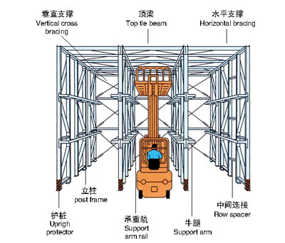 適用于儲存品種較單一,叉車可直接進(jìn)入貨架內(nèi)作業(yè),庫房空間利用率達(dá)80%。